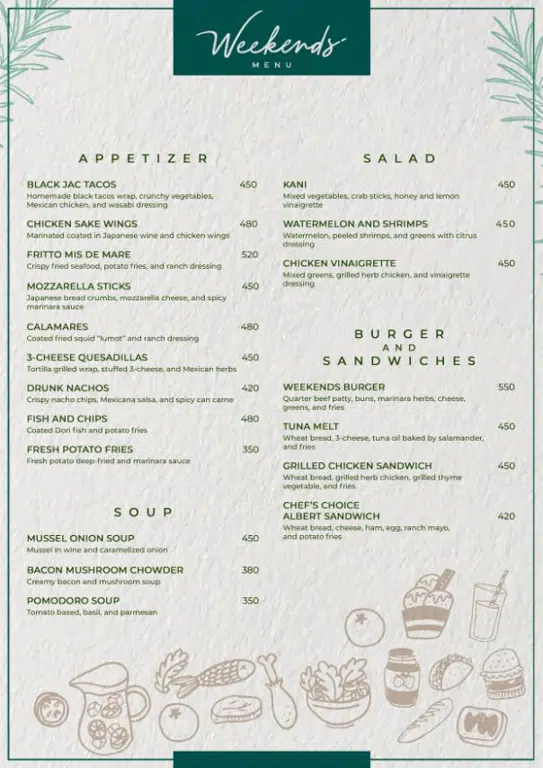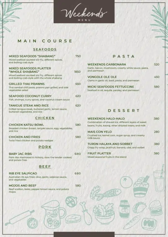 Maligayang Pagdating sa Weekends Restaurant! Ipinagmamalaki namin ang pagbibigay ng masarap at kaaya-ayang dining experience na tiyak na tatama sa panlasa ng lahat.
